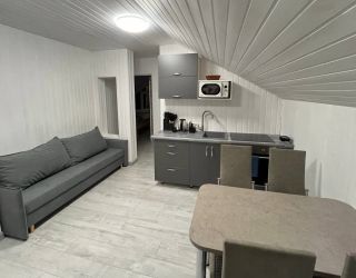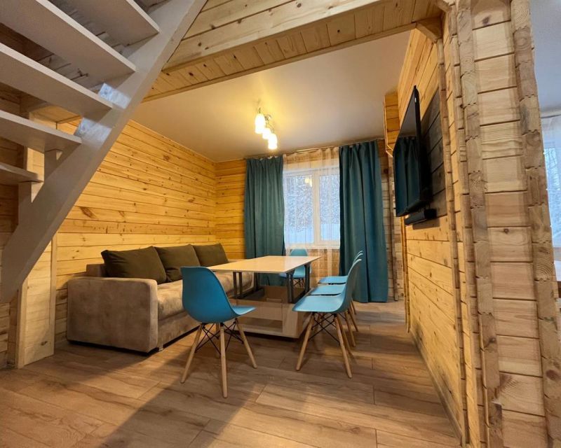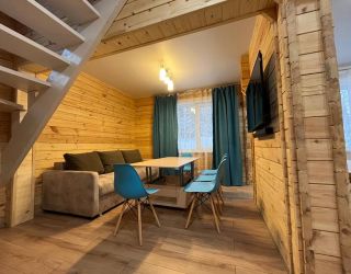 Комплекс на улице Хвойная включает в себя два двухэтажных коттеджа, рассчитанных на 10–12 гостей, и трехкомнатные апартаменты с террасой на мансардном этаже. В коттеджах – комфортабельные спальни, в гостиной предусмотрена обеденная зона, имеется полностью оснащенная кухня с плитой, посудомоечной машиной и прочей бытовой техникой. В ванных комнатах – душевая кабина, теплый пол, есть стиральная машина, фен, косметические наборы и тапочки.